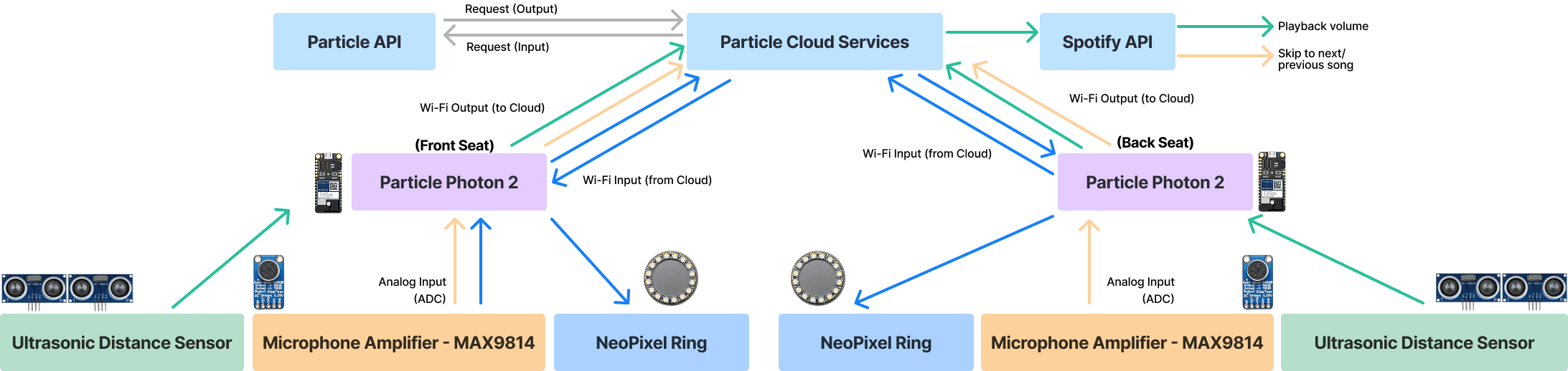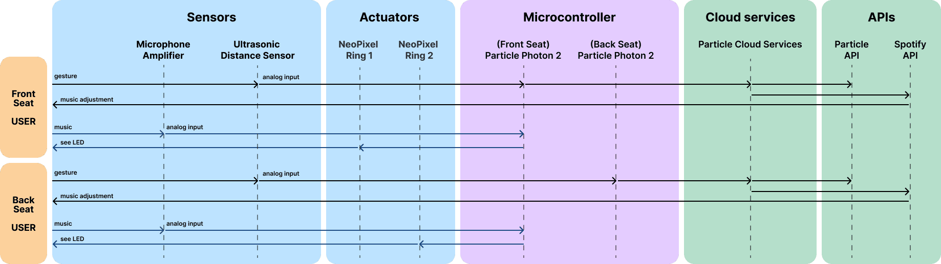 We aimed to create a Digital Ecosystem in which devices communicate throughout the vehicle to synchronize music control and ambient lighting.