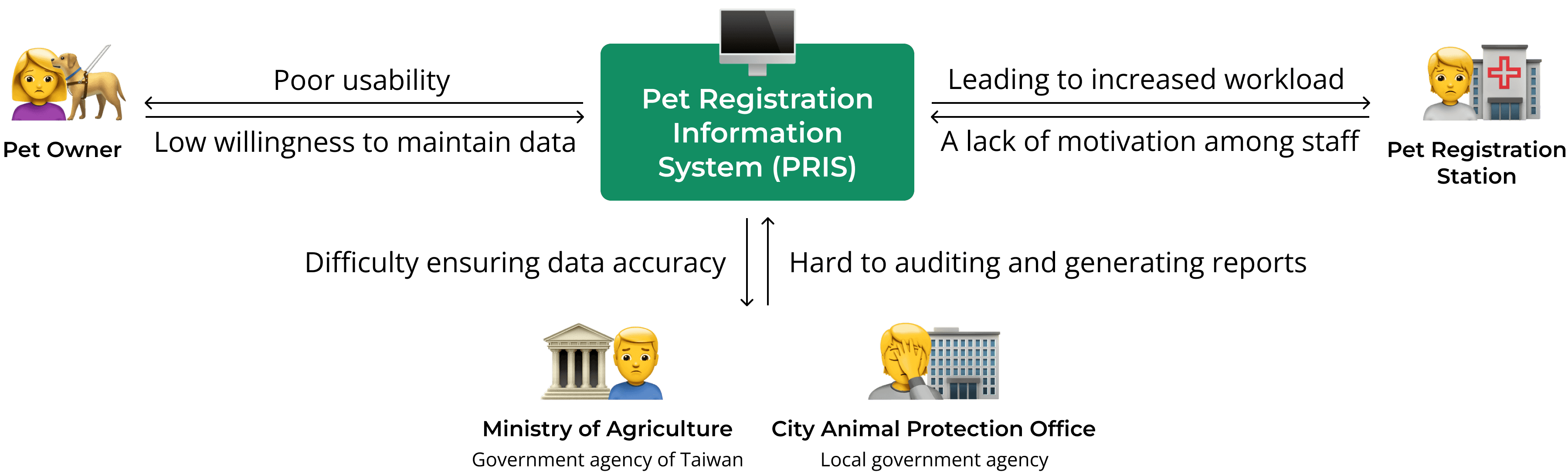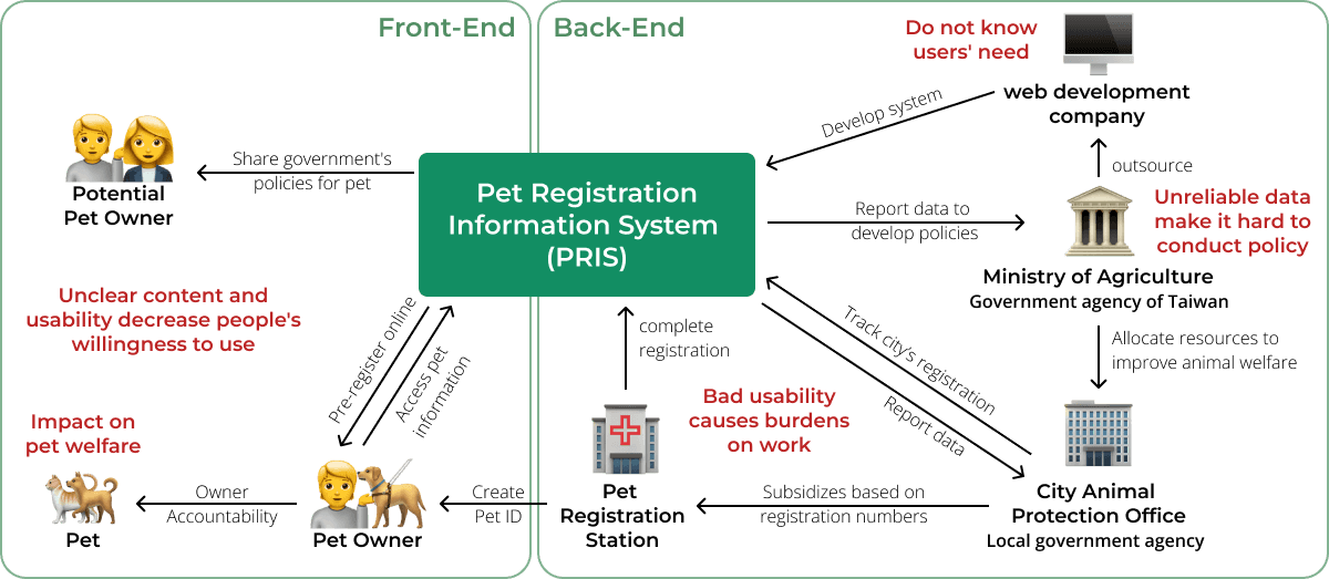 The Pet Registration Information System (PRIS) is the digital backbone of animal welfare in Taiwan, housing critical data on pets, owners, and strays. However, the system suffered from years of unstructured patch updates, rendering it nearly unusable. This project wasn't just about UI cleanup; it was about fixing a broken data pipeline. By improving usability, we aimed to increase accurate data entry from the public and vets, thereby empowering the government to make better decisions regarding stray animal management and welfare budgets.