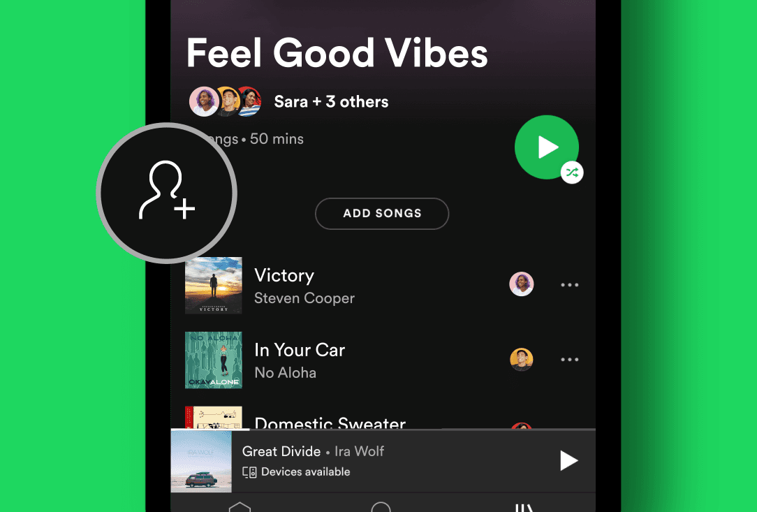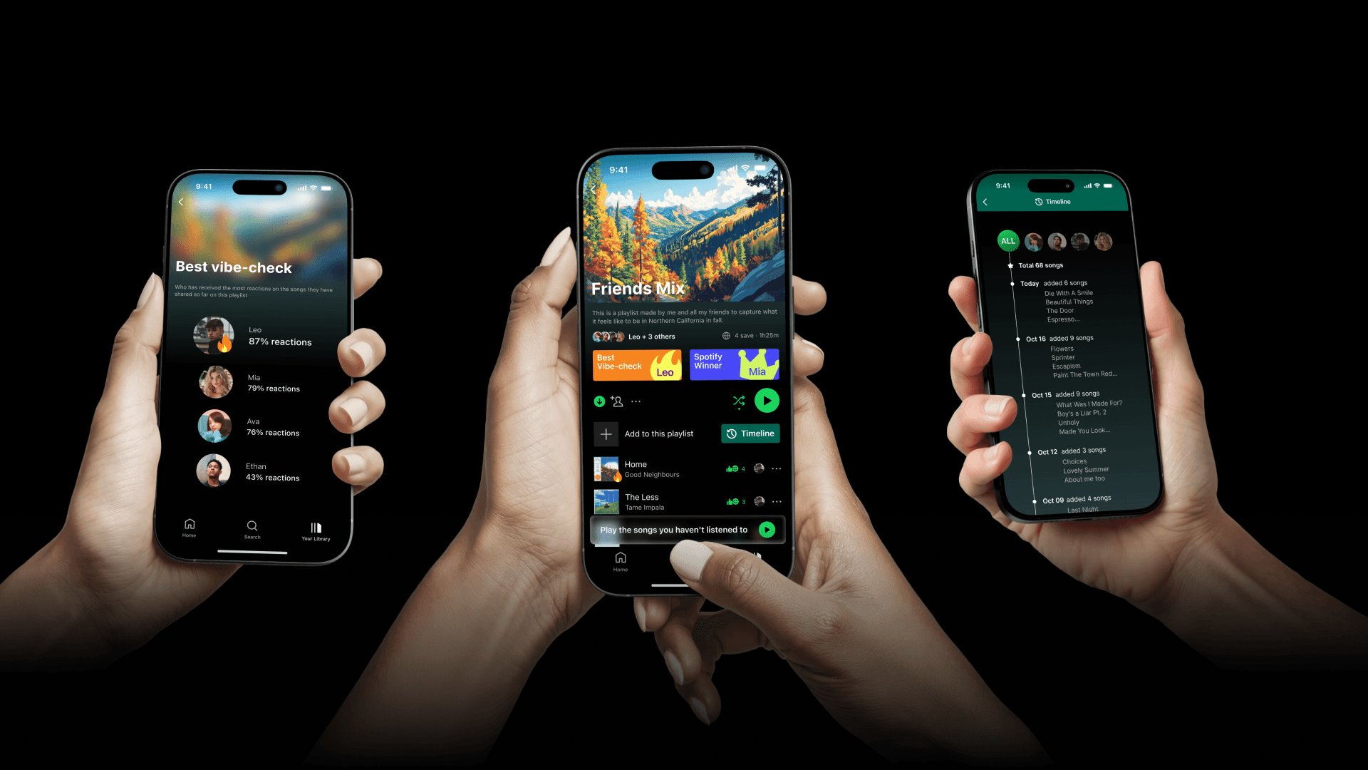 A new header for shared playlists that highlights group dynamics, such as "Music Addict" (most active listener) or "Vibe Check" (most liked songs).