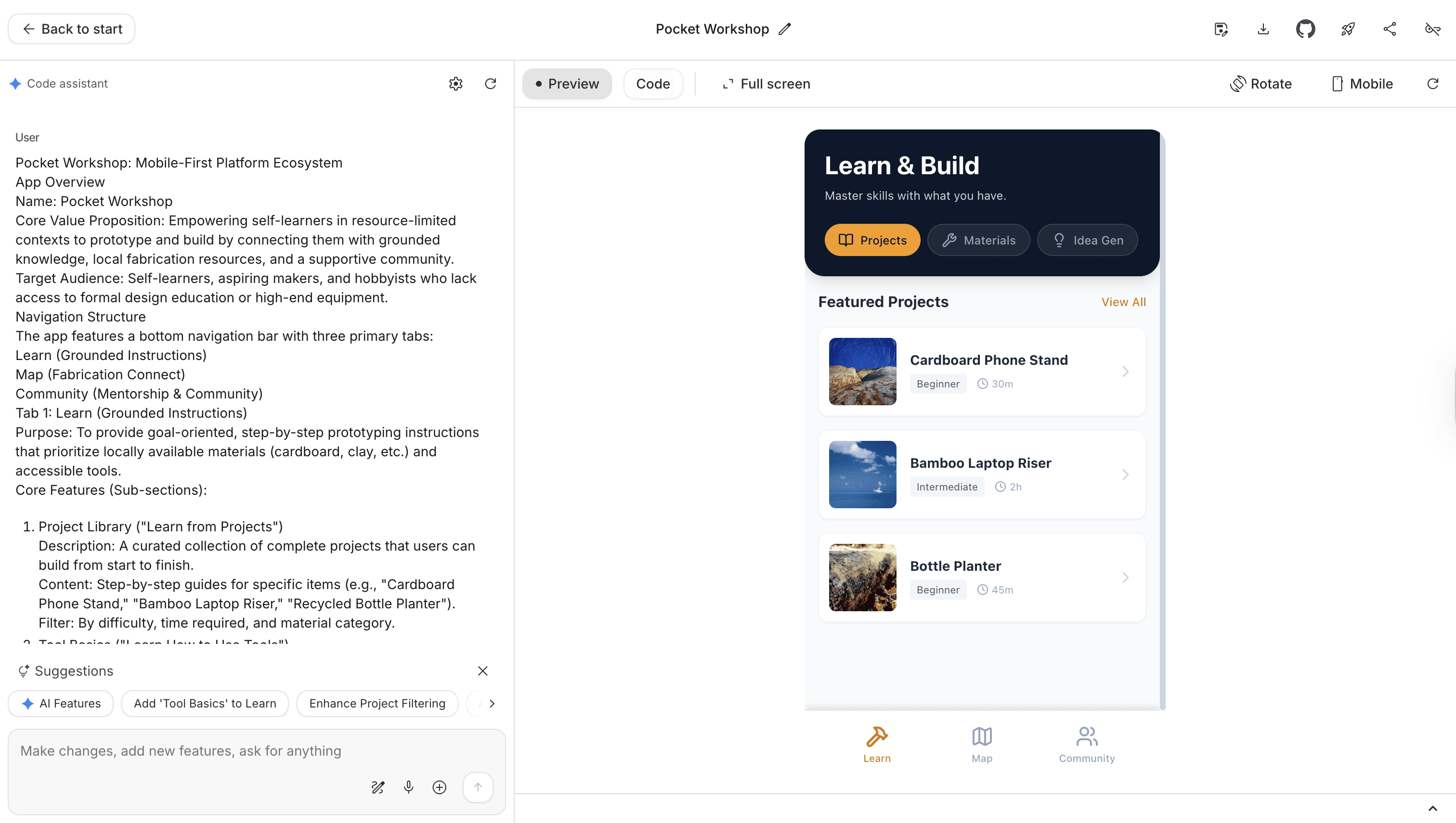 To move beyond static screens, I built a functional prototype using Google AI Studio. We conducted usability testing where novice designers were tasked with building a structure using only household items.