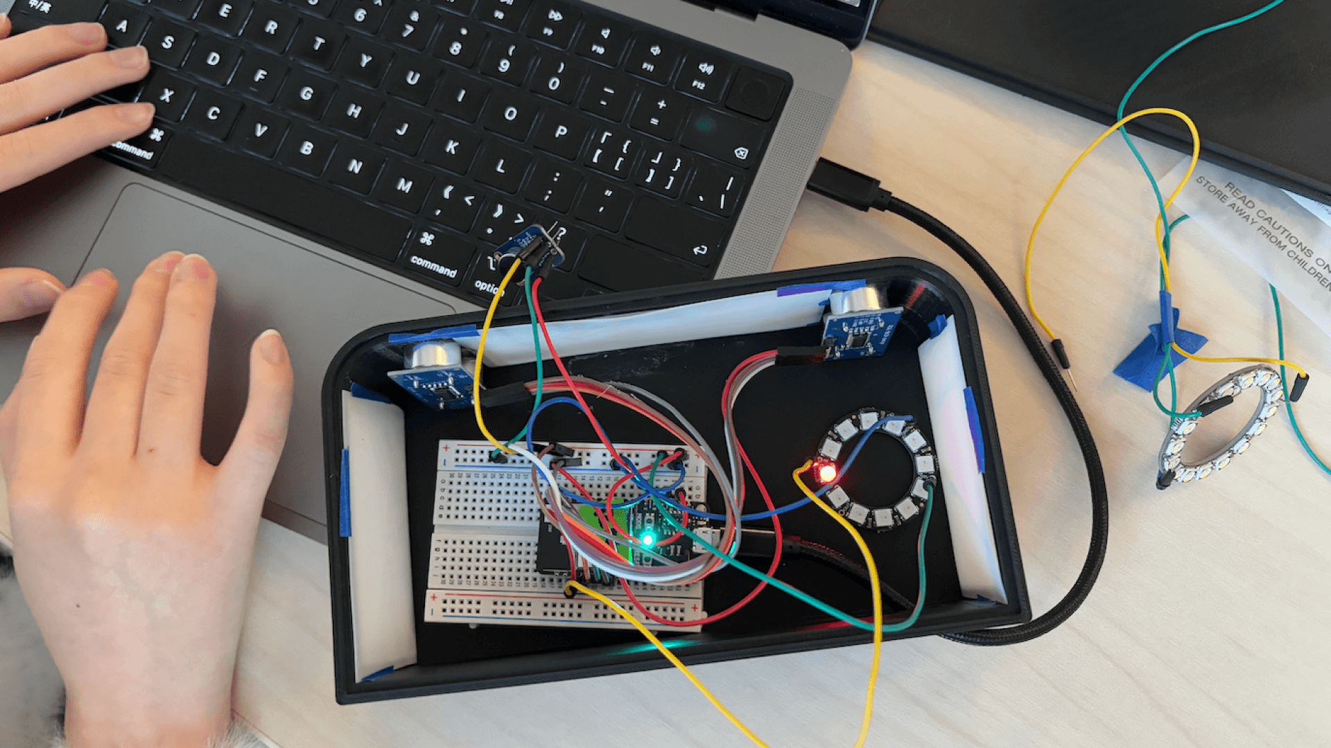 I led the development of the "Music Dynamic Display." I wired a Microphone Amplifier to the Photon 2 to detect audio frequencies. I then wrote C++ code to translate these frequencies into lighting patterns on Neopixel Rings. This required solving a critical hardware challenge: the Photon 2 operates at 3.3V, while the Neopixels require 5V. I had to re-engineer the power distribution to ensure the LEDs functioned brightly and consistently without crashing the microcontroller.
