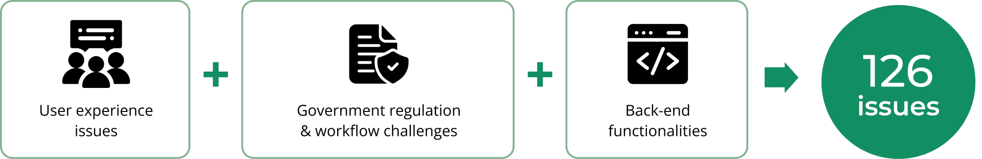 Through our research, we identified 126 issues spanning user experience concerns, government regulations, workflow challenges, and back-end functionalities. Among these, 56 user experience-related issues were refined through collaborative discussions with multiple stakeholders to confirm their needs.