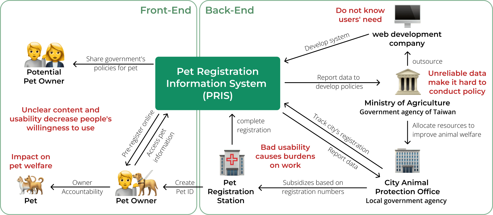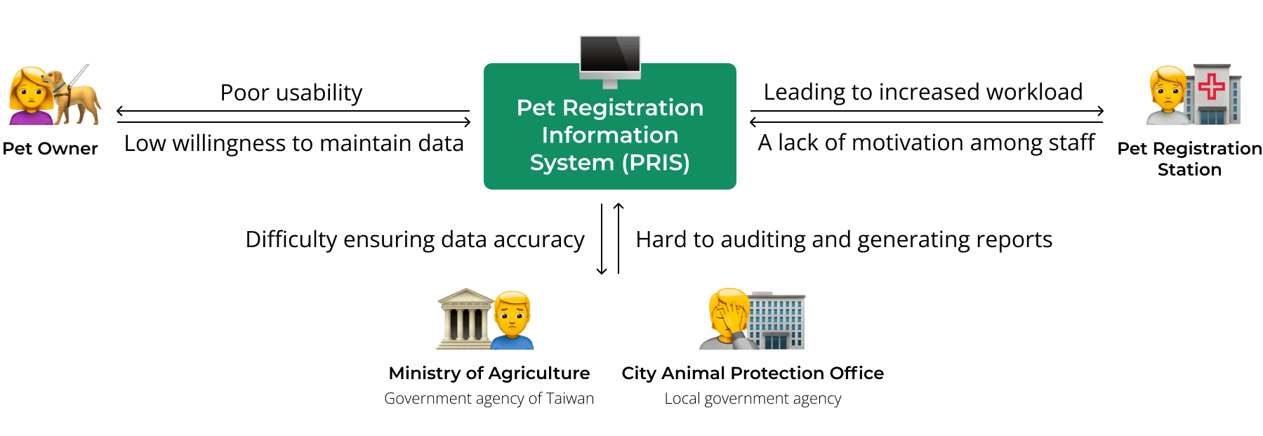 Before our team got involved, there was no communication channel among the various stakeholders. This led to the government being unaware of the needs and pain points of the implementers, the website development company being unaware of the obstacles the website posed to many tasks, and pet owners not understanding the purpose of the website. Our team's role is to serve as the communication bridge among these stakeholders and guide them on the next steps.